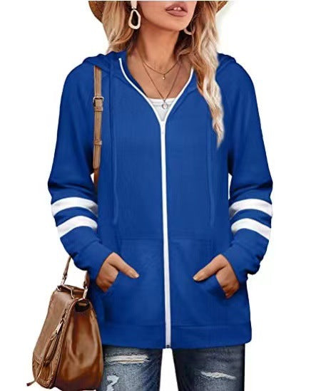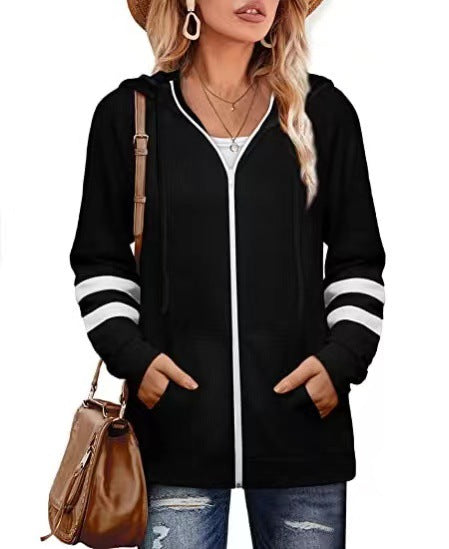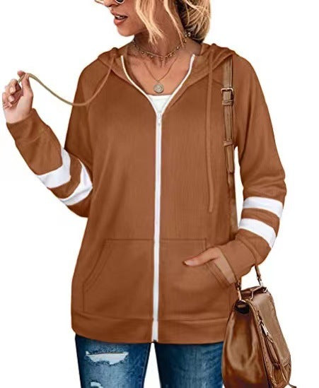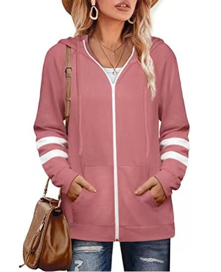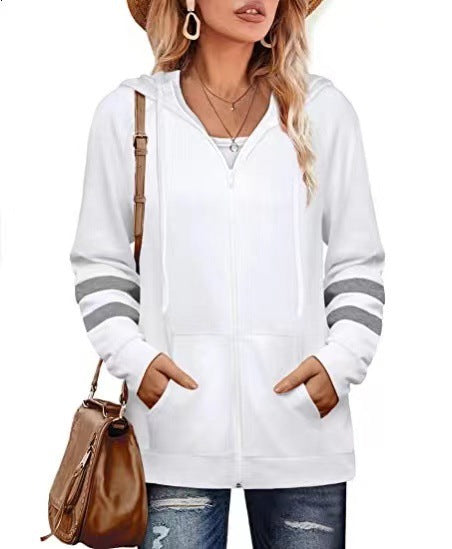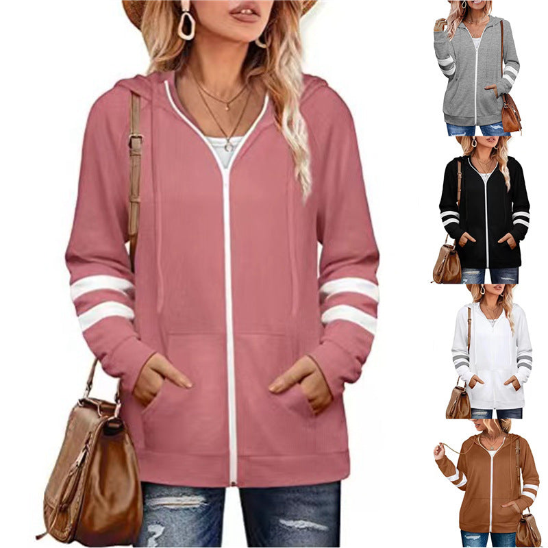 Este capuz leve com fechamento com zíper e mangas listradas é um encobrimento fofo e esportivo para qualquer conjunto casual. Tem uma bainha longa para uma melhor cobertura e bolsos para conveniência.