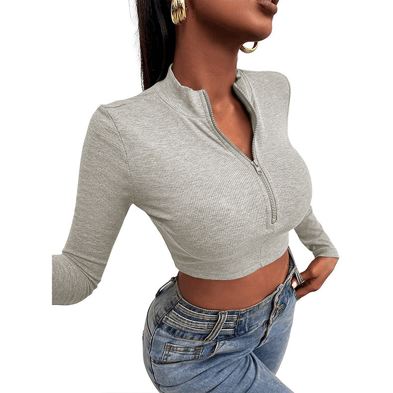 Dispoie sua figura nesta primavera e verão usando a blusa de decote em V Zipper com mangas compridas com um comprimento de corte, mangas compridas e um pescoço com zíper que permite personalizar sua aparência.