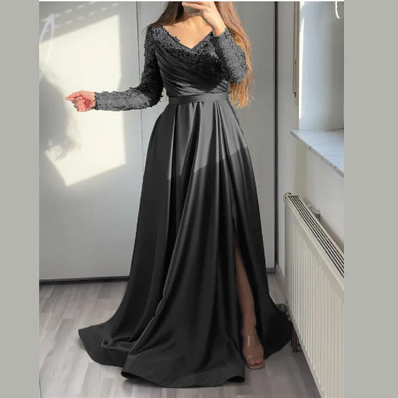 Vestido maxi de mangas compridas com decote em V e fenda da coxa