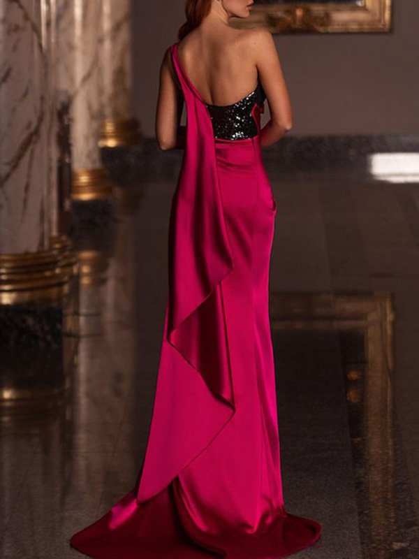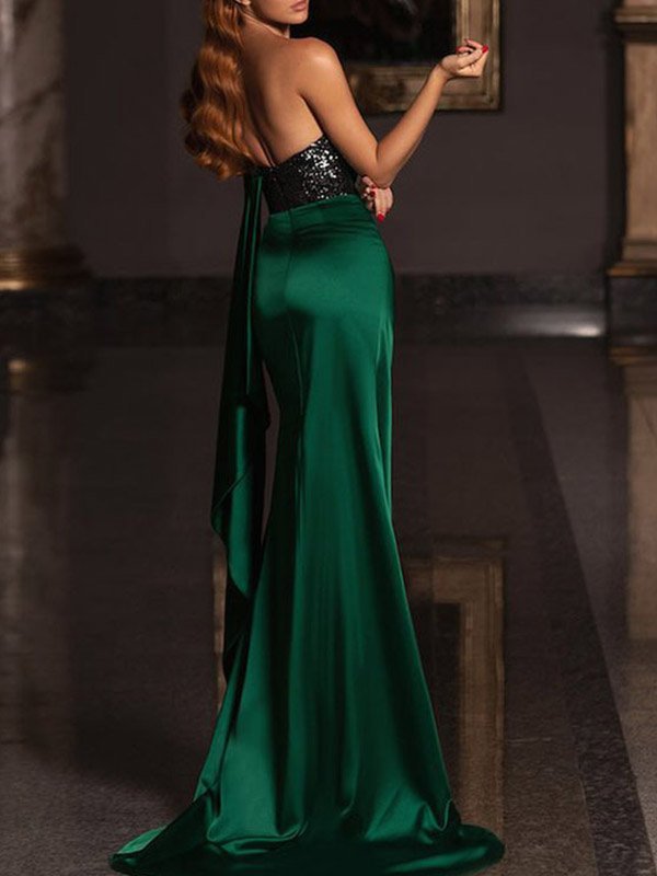 穿著高產和火車的女性懸垂絲滑織物連衣裙脫穎而出。它的火車在經典上優雅,可以掃地並具有閃閃發光的緊身胸衣以完成它。