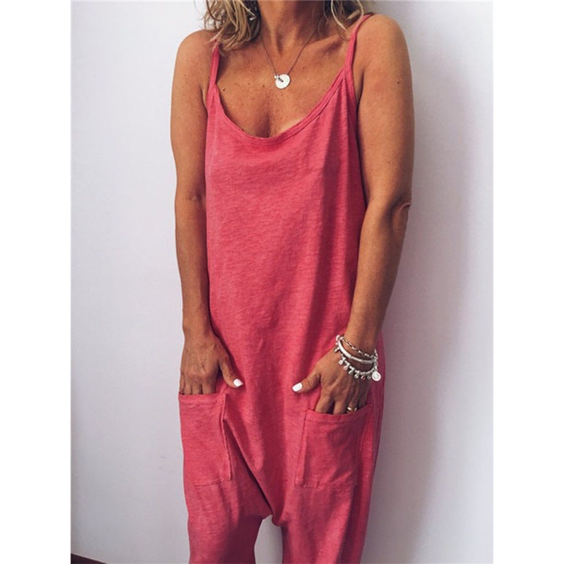女士的一件連身褲,帶口袋和意大利麵條皮帶是一種休閒可愛的方式,可以在家或旅途中穿衣服。它很鬆散,可以讓您舒適地走進來。
