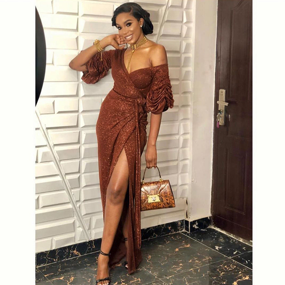 優雅而精緻的,這個女性的肩膀短袖長袖連衣裙具有低領口和高大的大腿縫隙,可輕鬆完成觸感。