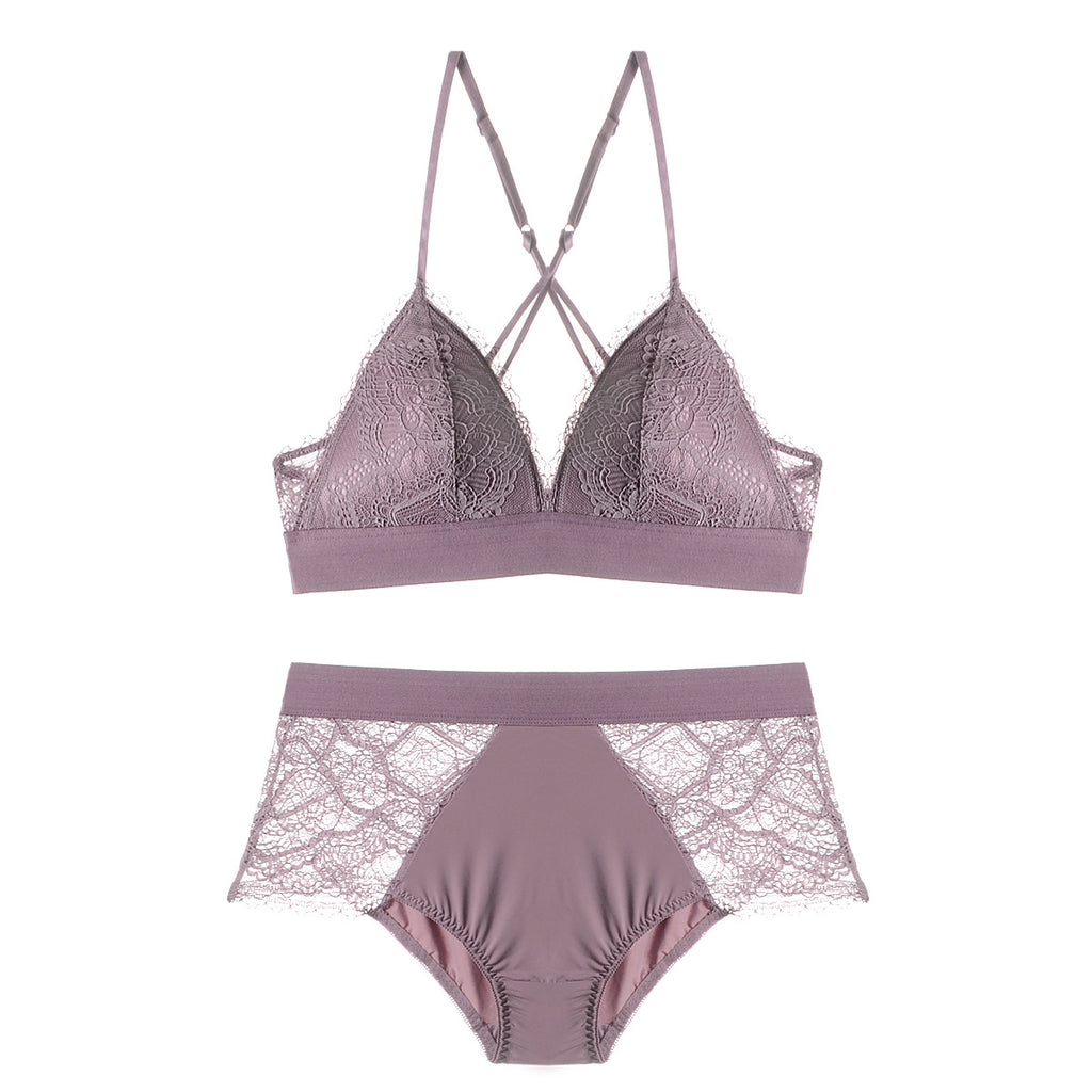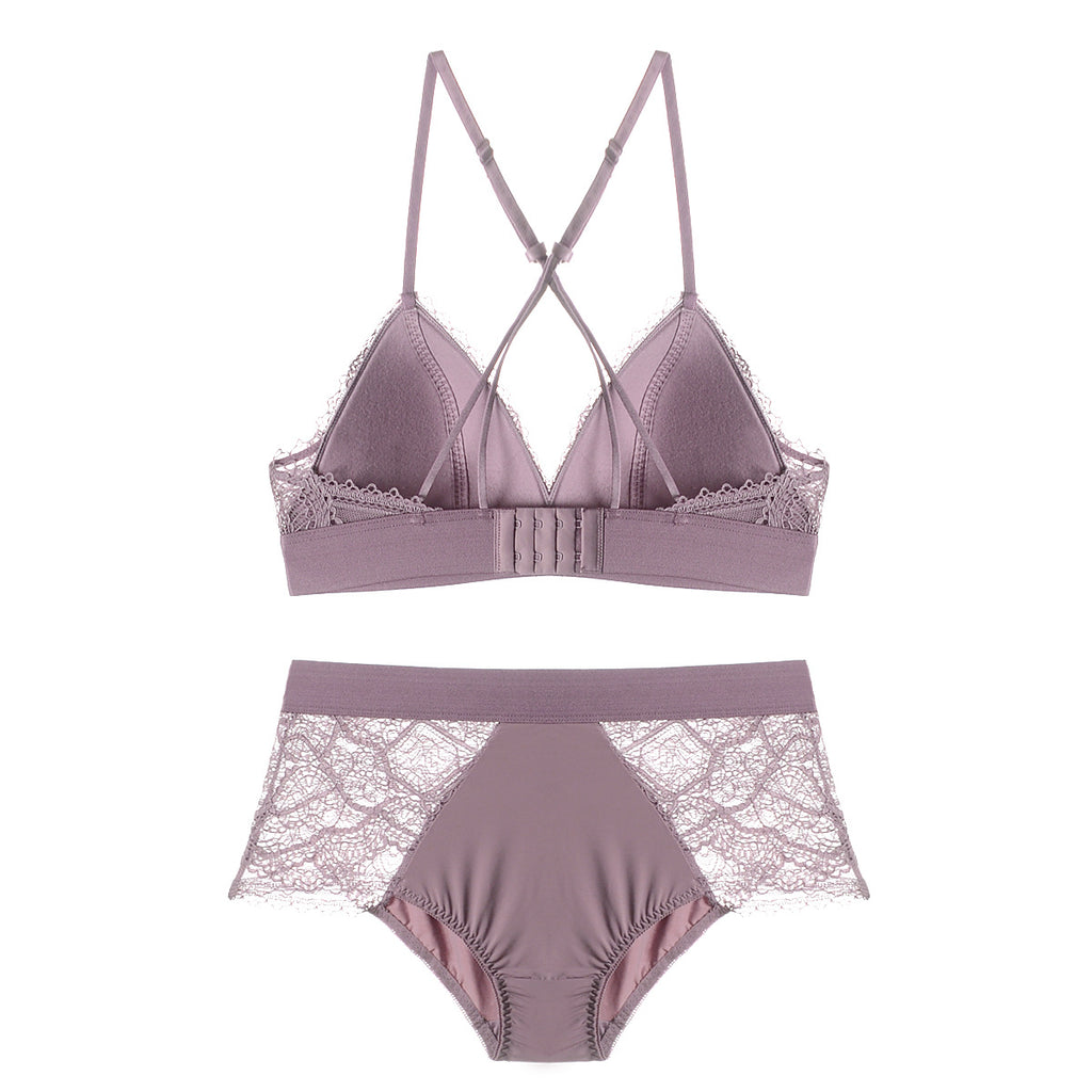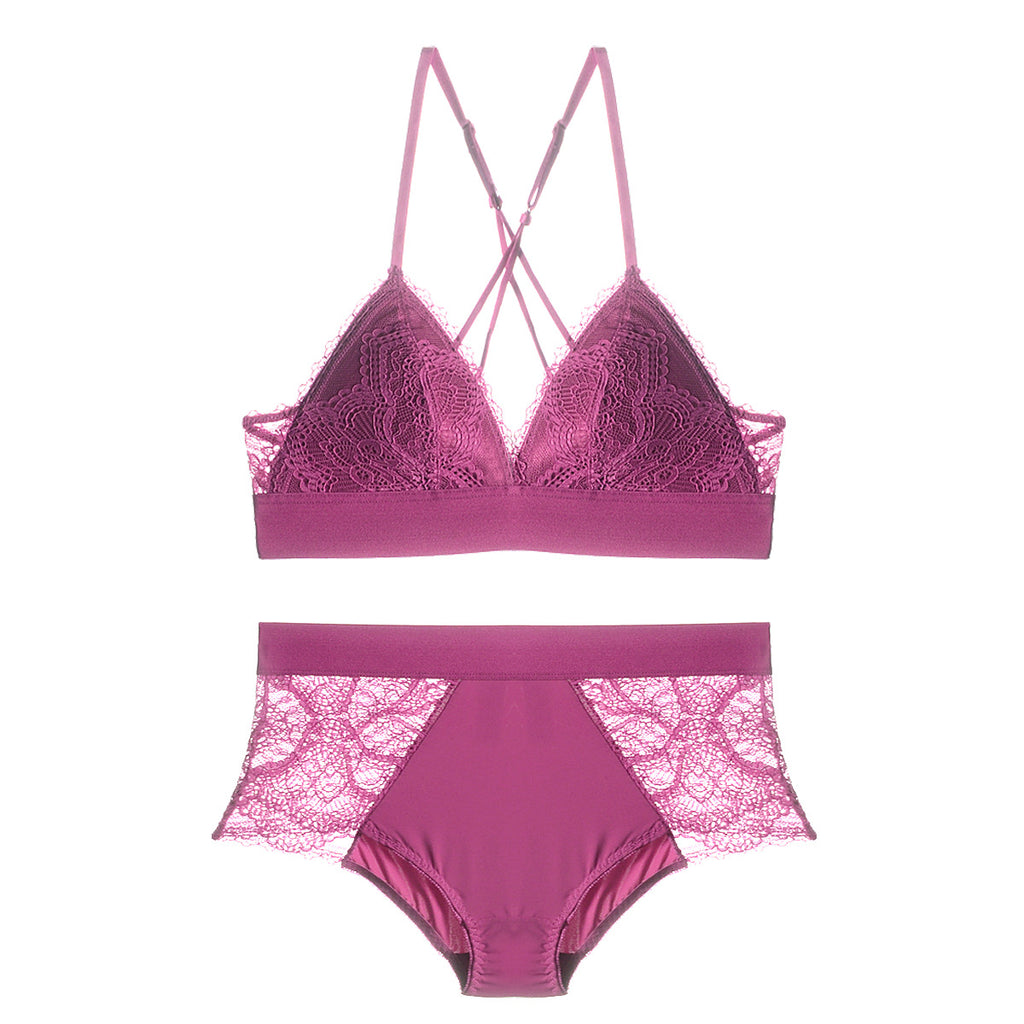 胸罩背面的切口設計和臀部的蕾絲切口使蕾絲中途公板和內褲設定了一個明顯但別緻的套裝。
