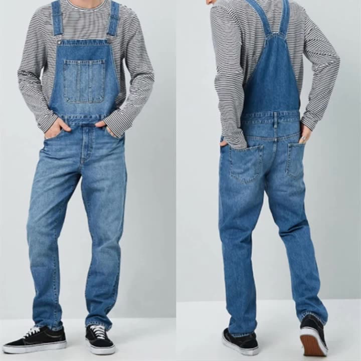 穿著男士經典的藍色牛仔布工作服,帶有口袋的經典外觀,帶有可調節的傳統皮帶,腰部和胸部周圍都可以調整口袋,以完成外觀。
