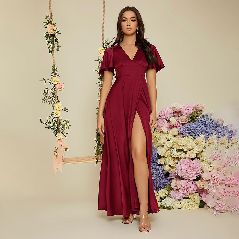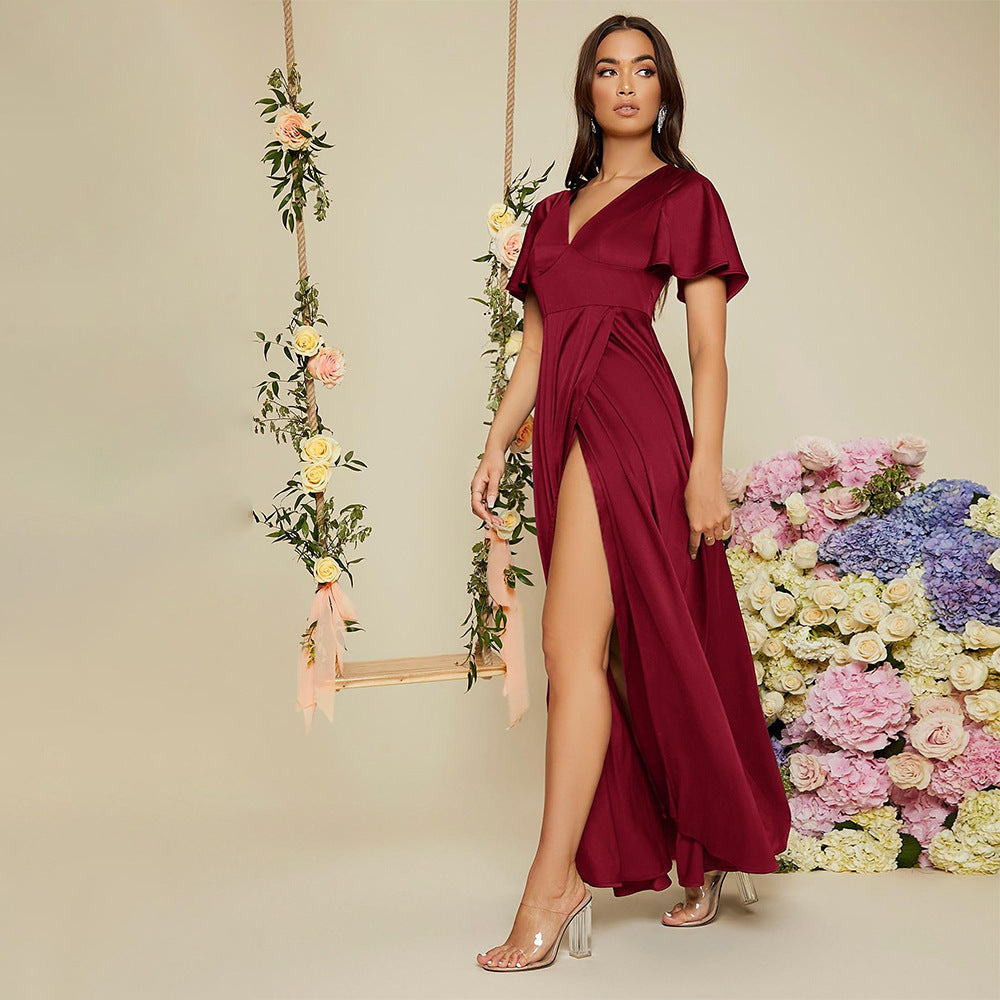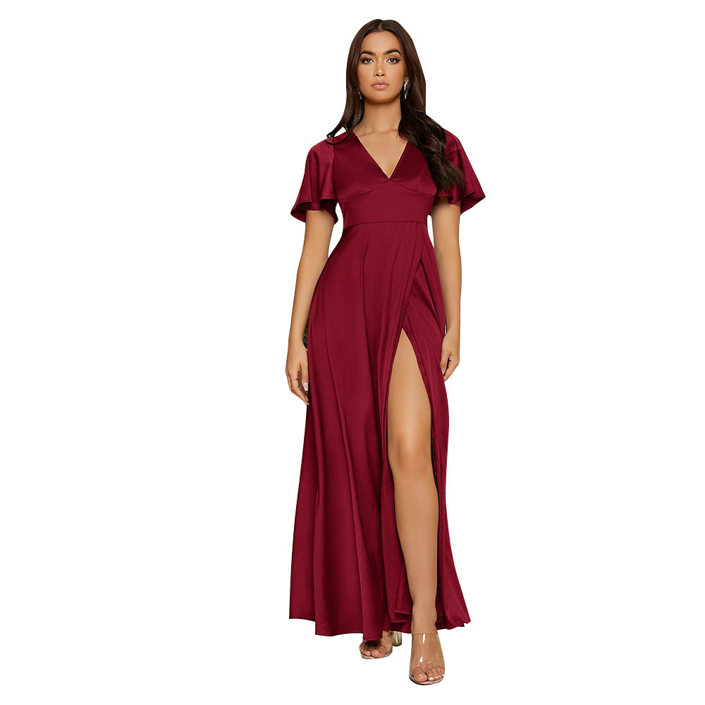 在您的下一次正式活動中脫穎而出,穿著女子短袖V領帝國腰部長裙,其大腿上的寬度高。這件衣服具有令人難以置信的流動,分層的外觀。